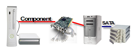 As the image outlines above, you need an HD capture card with analog component inputs. This card captures both the audio and video from the Xbox 360 via the component output cable. Audio will be passed either via the stereo outs on the component cable or via Toslink to your soundcard (the 5.1 Surround option). A four drive array of SATA disks provides enough disk write speed for real time capture of the HD video.