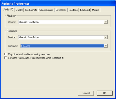 On the Audio I/O tab, verify your sound card is selected as the device for both playback and recording. In the channels dropdown box under Recording choose 1 (Mono). Unless you’ve got two microphones stereo simply doubles the same track, making the file size bigger.
