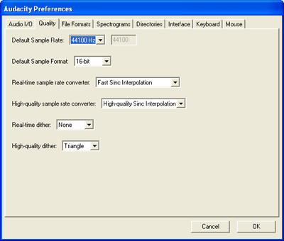 From the Quality tab choose 44,100 Hz as the Default Sample Rate and 16-bit as the Default Sample Format. Audio geeks may argue that higher sample rates and formats are better, but for introductory purposes, 44,100 and 16-bit will work admirably.