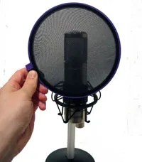 Plosive sounds are the percussive vocal blasts created when speaking words with hard ‘p’ and ‘b’ sounds. The sounds create a volume spike which skews your recording and may distort audio with a loud pop where the sound appeared. Try recording the phrase, “Boldly balancing pickles on punks in poodle skirts.” Those bursts of vocal impact can be held in check quite easily by putting a pop screen (sometimes called a pop blocker or pop filter) in front of the microphone. A pop screen is basically a thin nylon or metal mesh stretched on a frame.